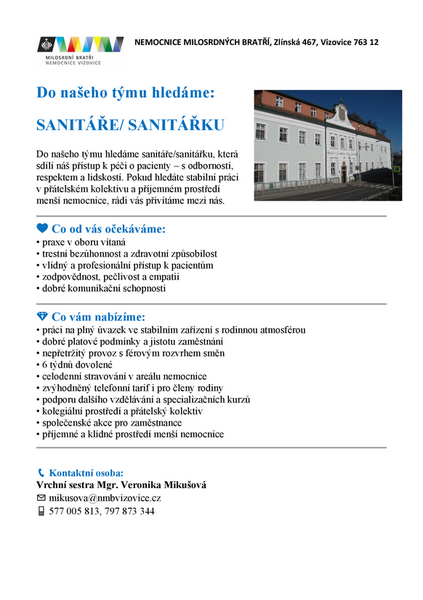 Do našeho týmu hledáme sanitáře/sanitářku, která sdílí náš přístup k péči o pacienty – s odborností, respektem a lidskostí. Pokud hledáte stabilní práci v přátelském kolektivu a příjemném prostředí menší nemocnice, rádi vás přivítáme mezi nás.