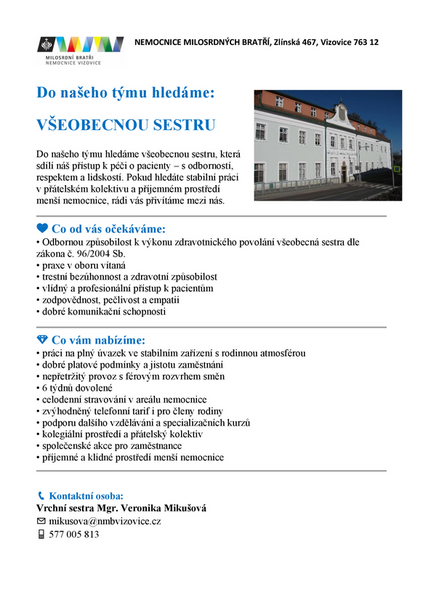 Do našeho týmu hledáme všeobecnou sestru, která sdílí náš přístup k péči o pacienty - s odborností, respektem a lidskostí. Pokud hledáte stabilní práci v přátelském kolektivu a příjemném prostředí menší nemocnice, rádi vás přivítáme mezi nás.
