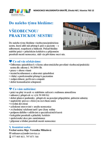 Do našeho kolektivu přijmeme ihned všeobecnou/praktickou sestru. Nabízíme příjemné prostředí malé nemocnice, náborový příspěvek 50 000 Kč. Více info na letáčku: